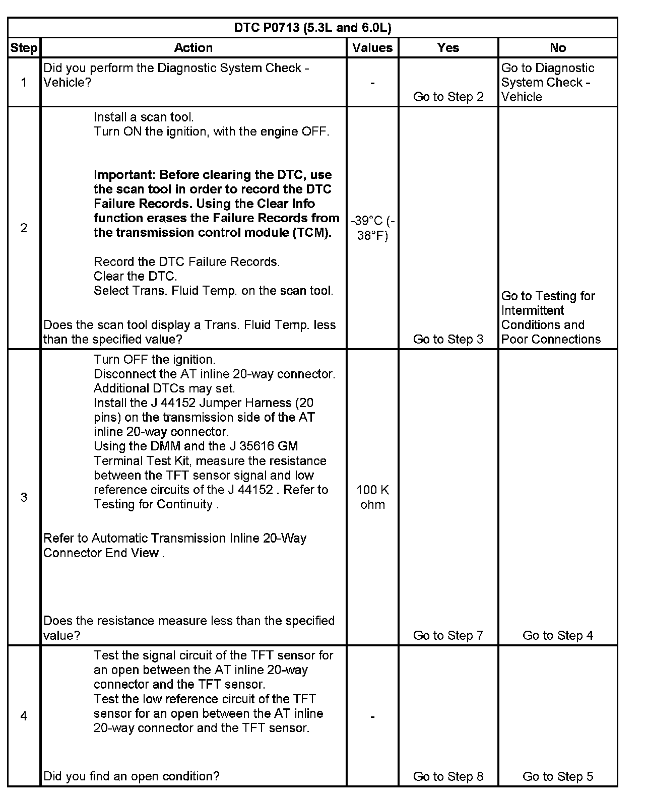If the TCM detects an open or short to voltage in the TFT sensor or signal circuit, then DTC P0713 sets. DTC P0713 is a type C DTC.