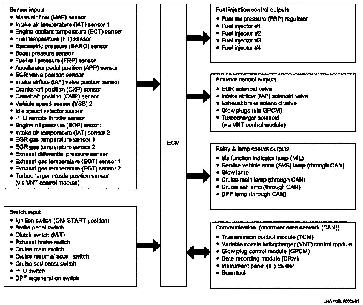 The ECM constantly observes the information from various sensors. The ECM controls the systems that affect vehicle performance. The ECM performs the diagnostic function of the system. The ECM can recognize operational problems, alert the driver through the malfunction indicator lamp (MIL), and store diagnostic trouble codes (DTCs). DTCs identify the system faults to aid the technician in making repairs.