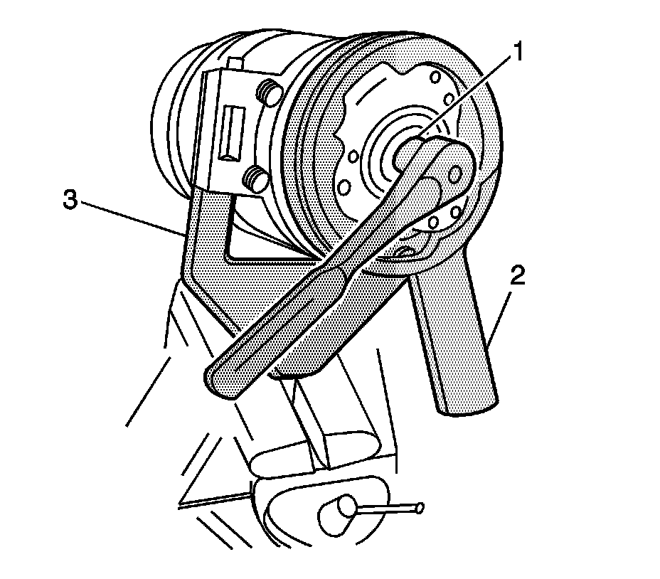9. Install the shaft nut. Hold the clutch drive plate and the hub assembly with the J 33027-A (2). Use the J 33022 (1) and tighten the nut against the compressor shaft shoulder.