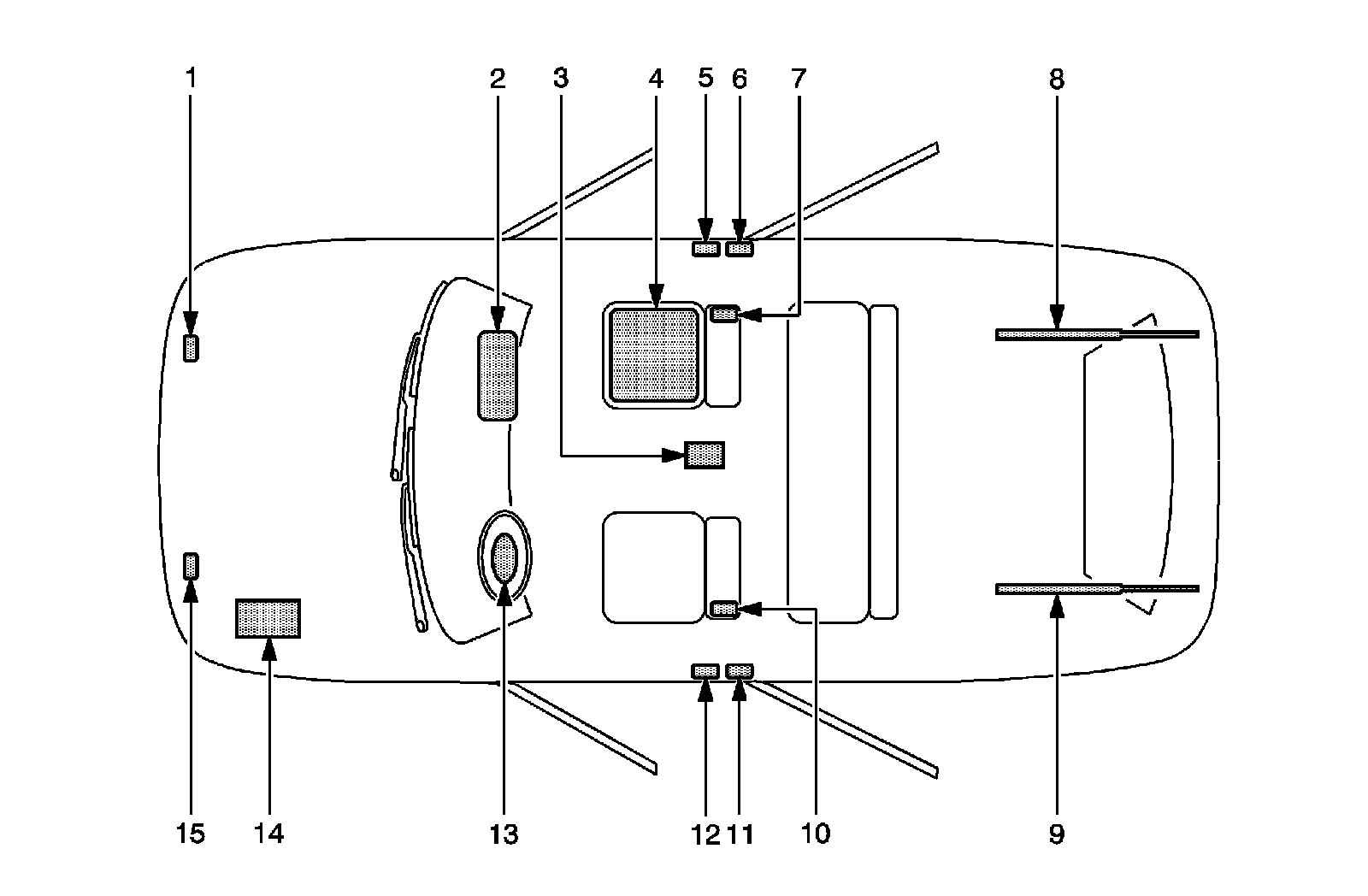 15 - Left Front End Sensor-Located on the left front of the vehicle in the engine compartment