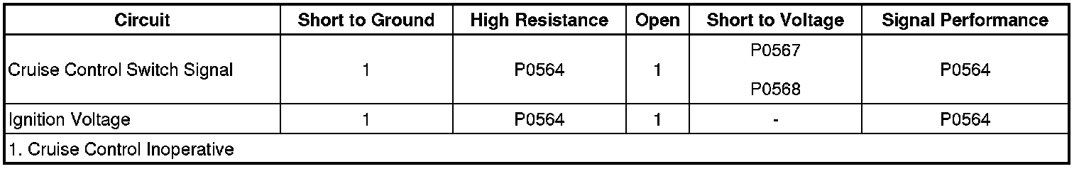 The cruise control switch is an input to the engine control module (ECM). The ECM monitors the cruise control switch signal circuit in order to detect when a cruise control function has been requested. The ECM detects a specific voltage signal on the cruise control switch signal circuit when a cruise control function switch is activated, with each switch having a different predetermined voltage value.