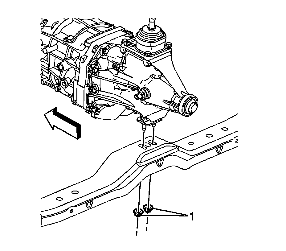 3. Lower the transmission and install the two nuts (1) securing the transmission mount to the transmission support.