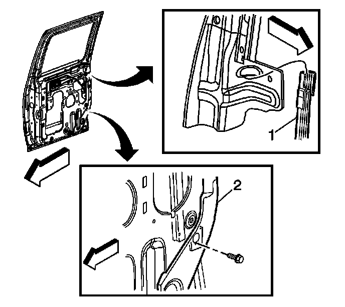 6. Remove the bolt retaining the rear door window run channel to the inner door panel (2).