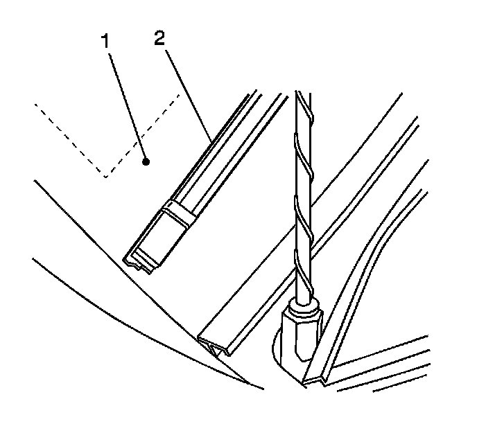 5. For the driver side blade (2), ensure the wiper blade tip is held in position to the alignment dot (1) on the windshield.
