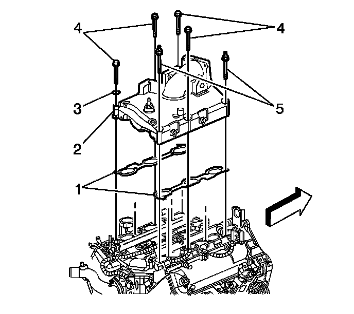 4. Apply threadlock GM P/N 12345382 (Canadian P/N 10953489) to the bolt threads. Install the upper intake manifold bolts (4, 5).