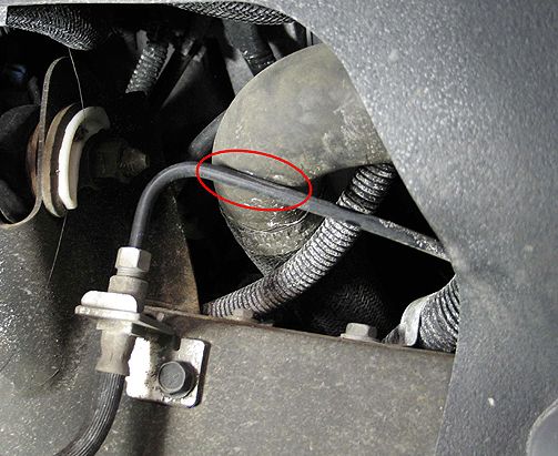 Inspect the lower (outlet) radiator hose and right front brake pipe for contact at the location indicated in the picture. If there is contact, and rub through of the hose has occurred, replace the lower radiator hose and reposition the brake pipe so there is 10 mm (0.394 in) of clearance between the hose and pipe. To reposition the brake pipe away from the hose, carefully bend the pipe mounting bracket downward until proper clearance has been achieved.