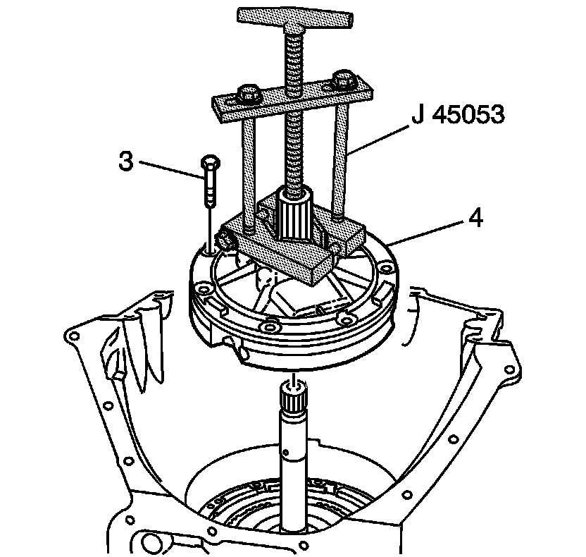 5. Turn the handle of the J 45053 down onto the turbine shaft in order to raise the oil pump assembly (4) out of the case.