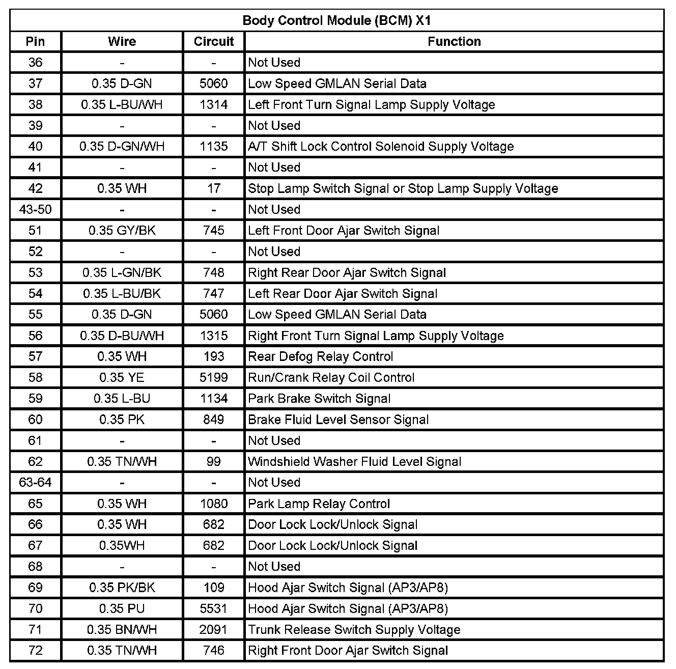 Body Control Module (BCM) X1 (Pin 36 To 72):