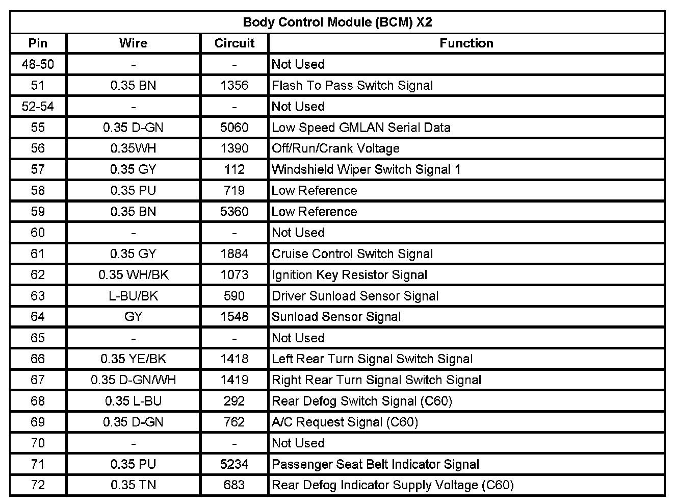 Body Control Module (BCM) X2 (Pin 48 To 72):