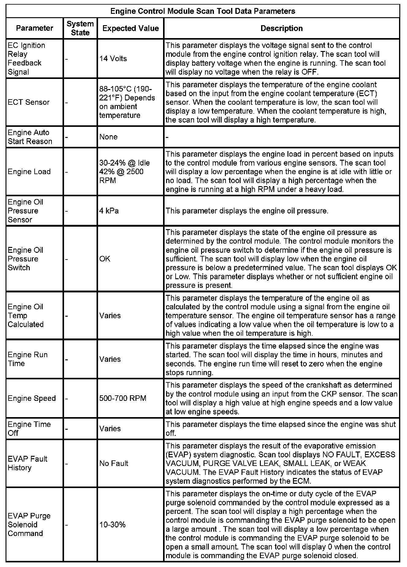 Scan tool values from a properly running engine may be used for comparison with the engine you are diagnosing. The Engine Scan Tool Data List represents values that would be seen on a normal running engine.