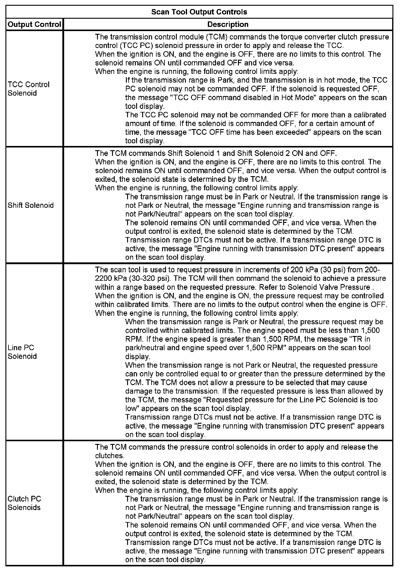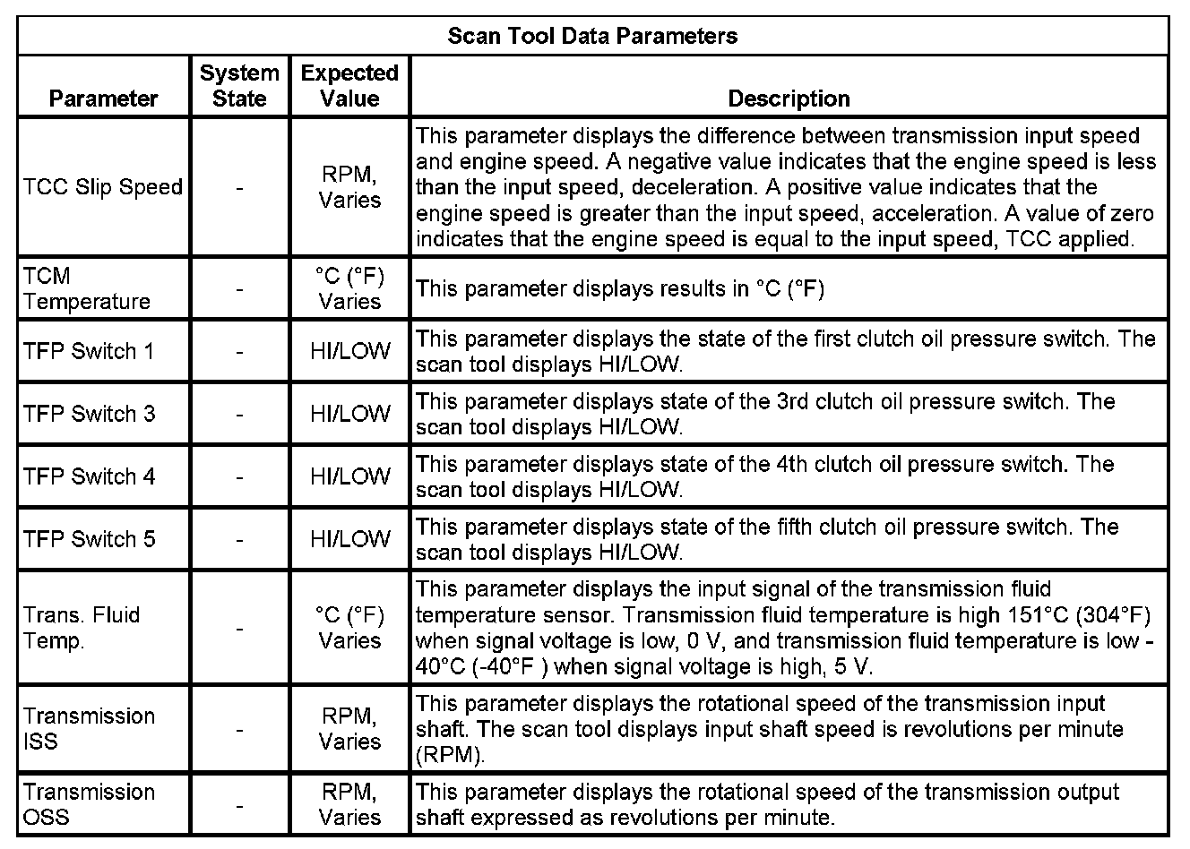The Transmission Control Module Scan Tool Data List contains all transmission related parameters that are available on the scan tool. The list is arranged in alphabetical order. A given parameter may appear in any one of the data lists, and in some cases may appear more than once, or in more than one data list in order to group certain related parameters together.