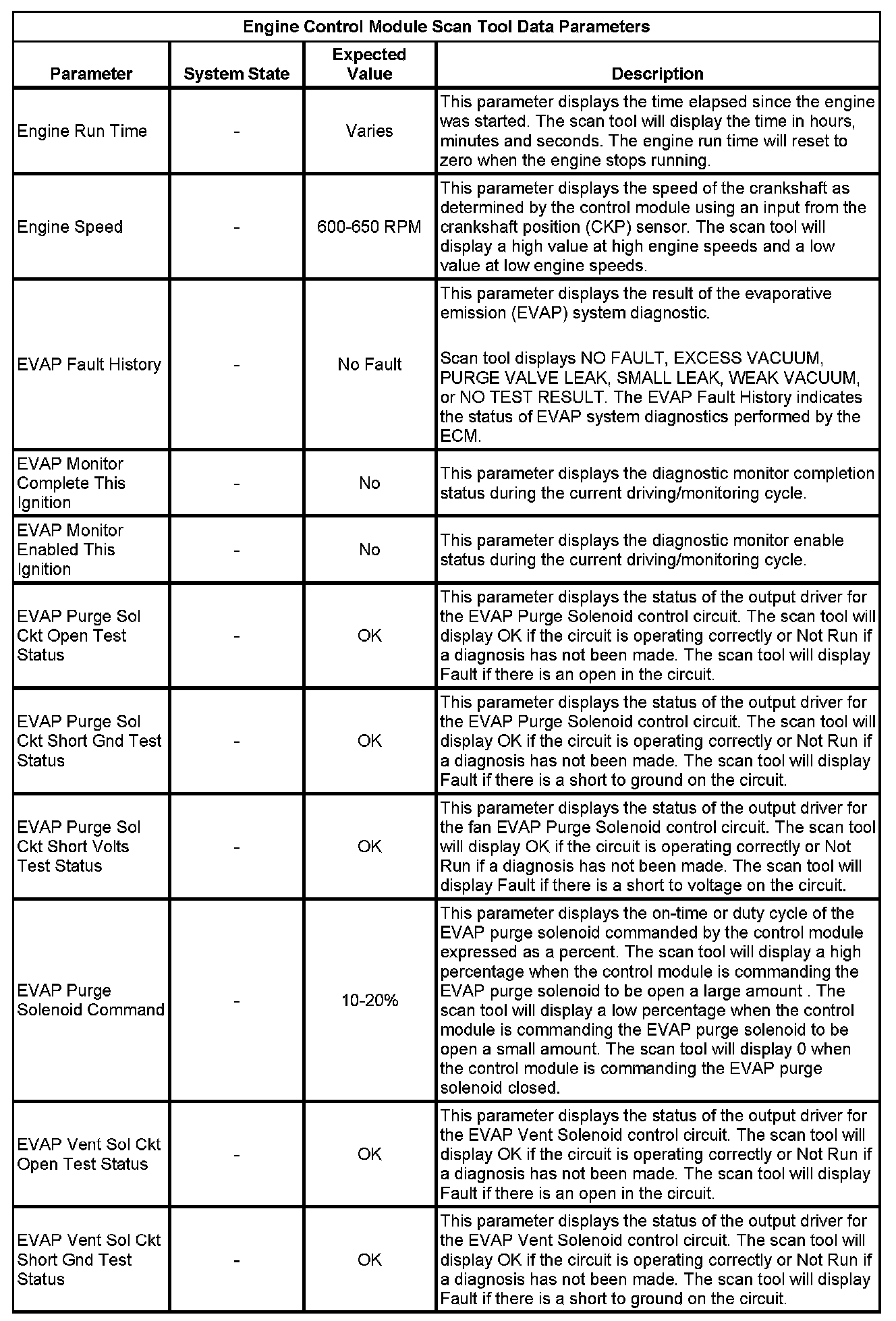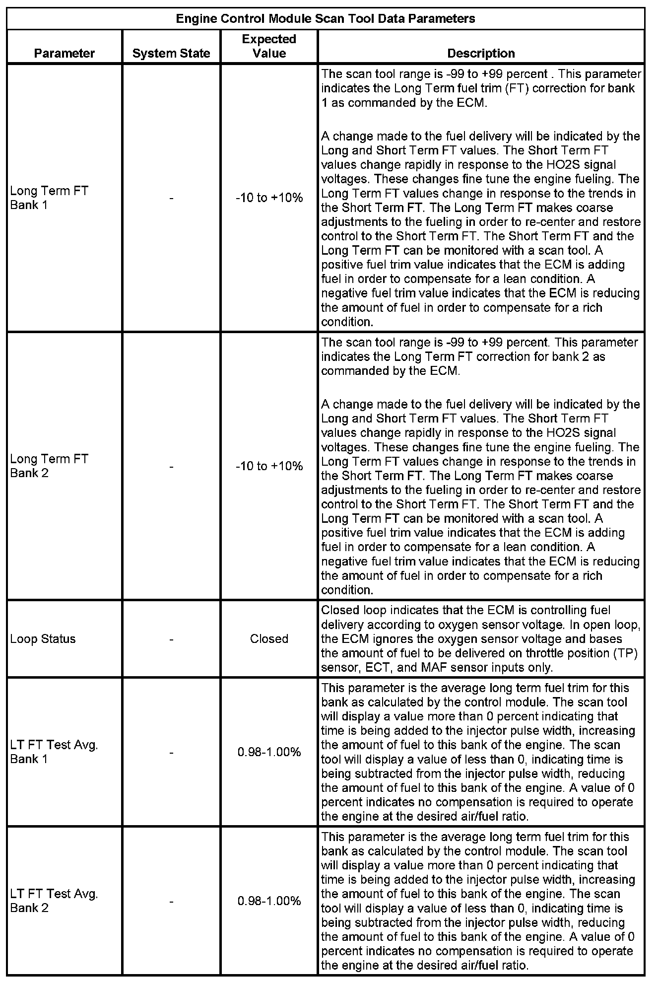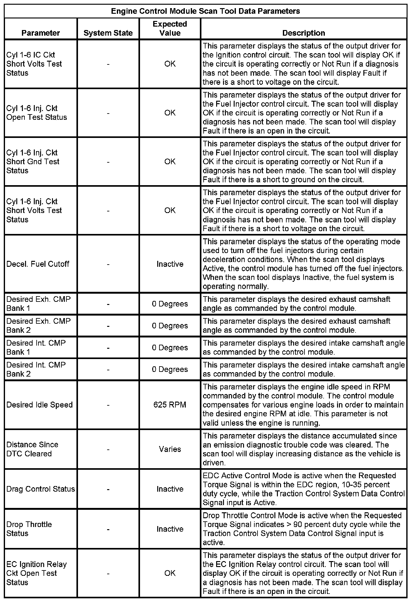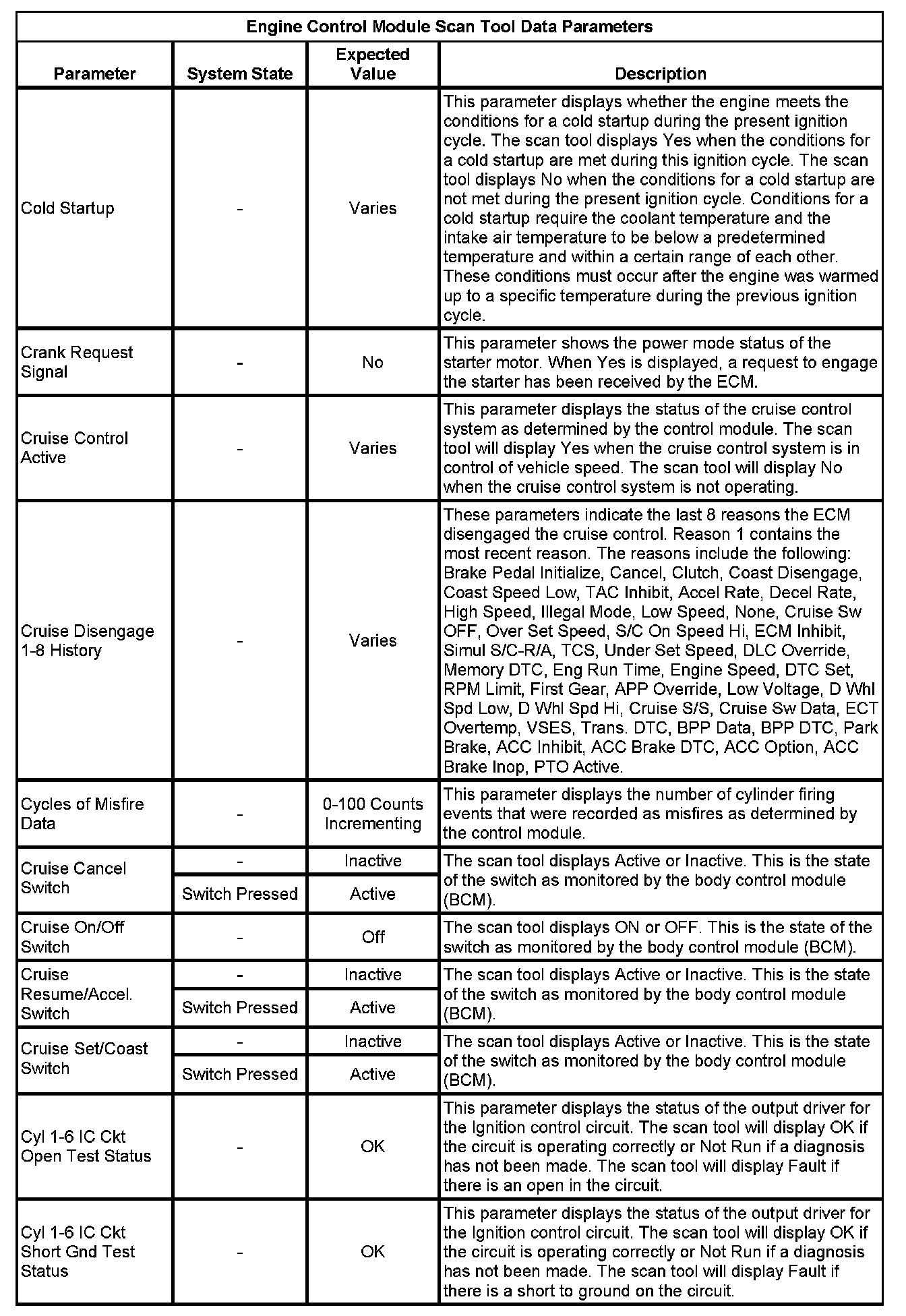 The Engine Control Module Scan Tool Data List contains all engine-related parameters that are available on the scan tool. The list is arranged in alphabetical order. A given parameter may appear in any one of the data lists, and in some cases may appear more than once, or in more than one data list in order to group certain related parameters together.