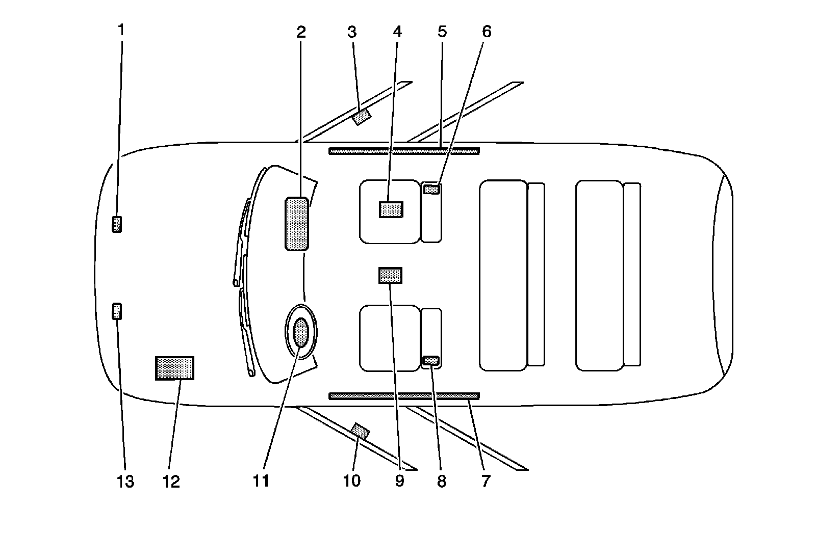 The SIR Identification Views shown below illustrate the approximate location of all SIR components available for the vehicle. This will assist in determining the appropriate SIR Disabling and Enabling for a given service procedure, refer to SIR Disabling and Enabling.