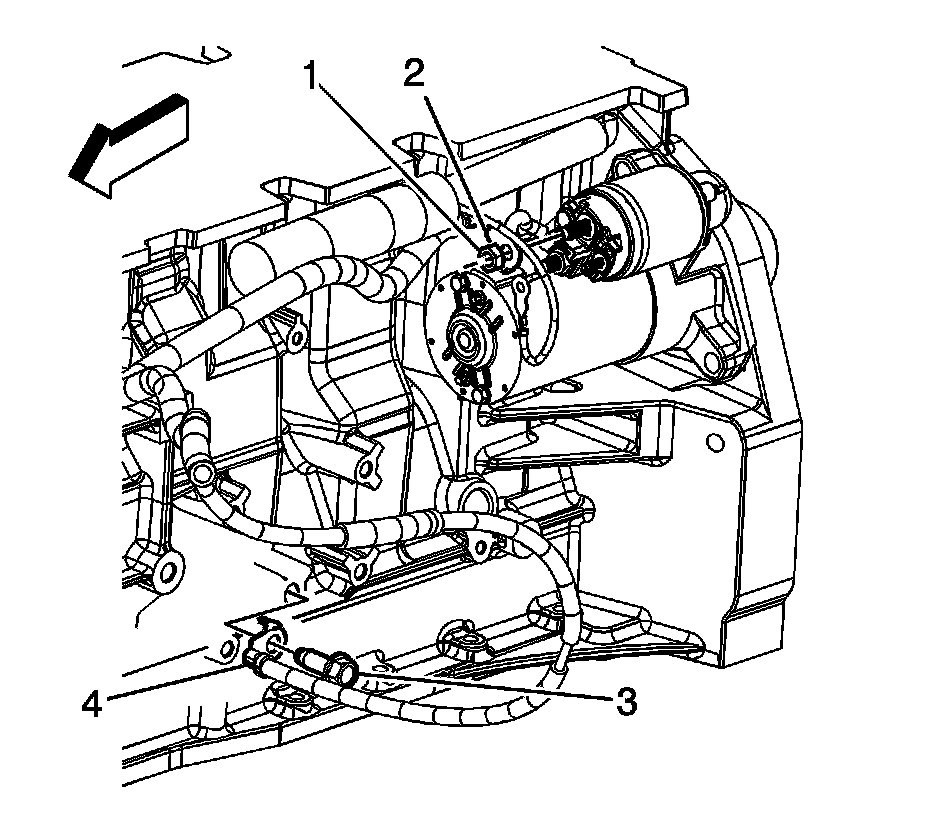 7. Remove the negative battery cable clip (3) from the shock tower.