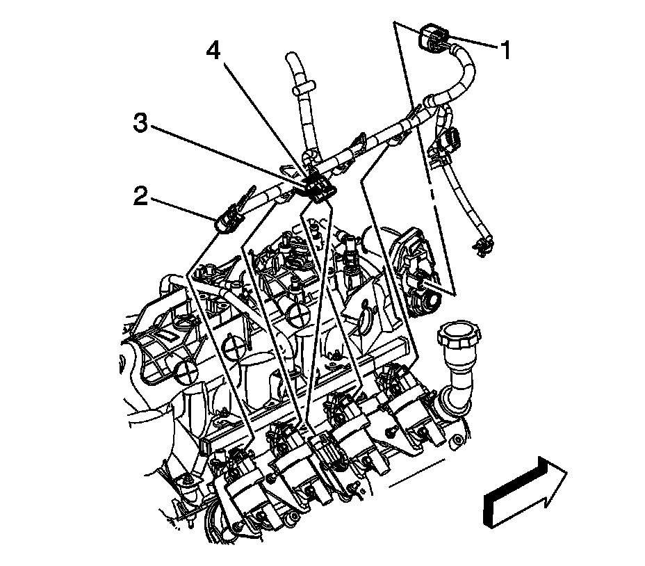 24. Install the right side CPA retainer (4) to the engine wiring harness main ignition coil electrical connector.