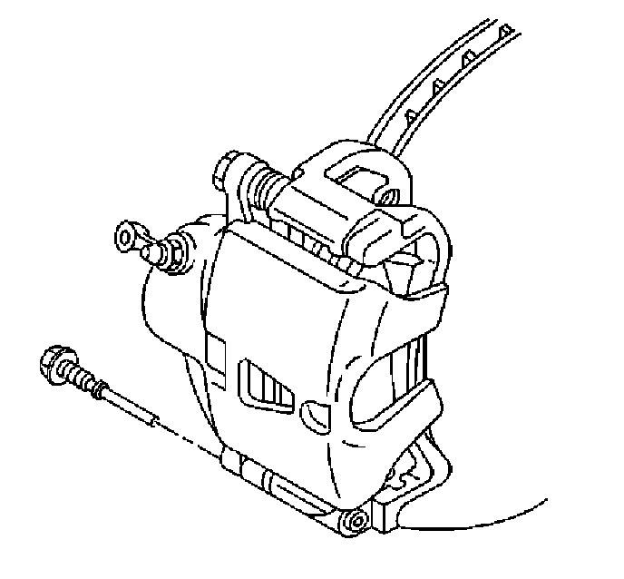 Notice: Support the brake caliper with heavy mechanic wire, or equivalent, whenever it is separated from its mount and the hydraulic flexible brake hose is still connected. Failure to support the caliper in this manner will cause the flexible brake hose to bear the weight of the caliper, which may cause damage to the brake hose and in turn may cause a brake fluid leak.