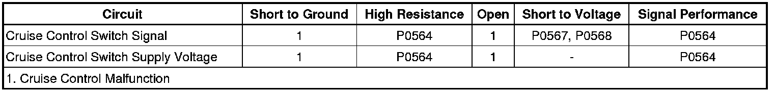 The cruise control switch is an input to the engine control module (ECM). The ECM monitors the cruise control switch signal circuit in order to detect when a cruise control function has been requested. The ECM detects a specific voltage signal on the cruise control switch signal circuit when a cruise control function switch is activated, with each switch having a different predetermined voltage value. The BCM monitors the cruise control cancel switch signal circuit and also sends a serial data message to the ECM indicating the status of the cruise cancel switch.