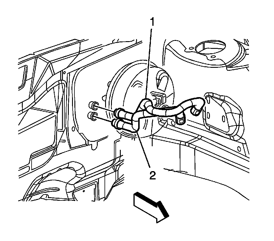 2. Disconnect both of the heater hose clamps (1) at the heater core using the J 38185.