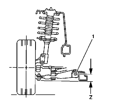 3. Measure the Z dimension for the left and right side of the vehicle. The Z dimension is the vertical distance measured between the centerline of the lower control arm bolt (1) and the bottom of the ball joint.