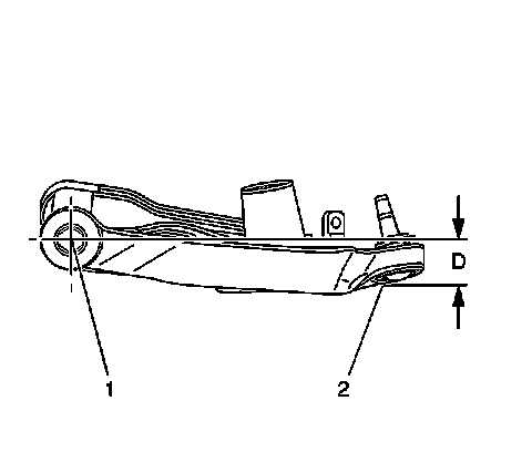 * The D dimension for IRS vehicles is the vertical distance measured between the horizontal centerline of the lower control arm bolt (1) and the bottom of the ball joint (2).