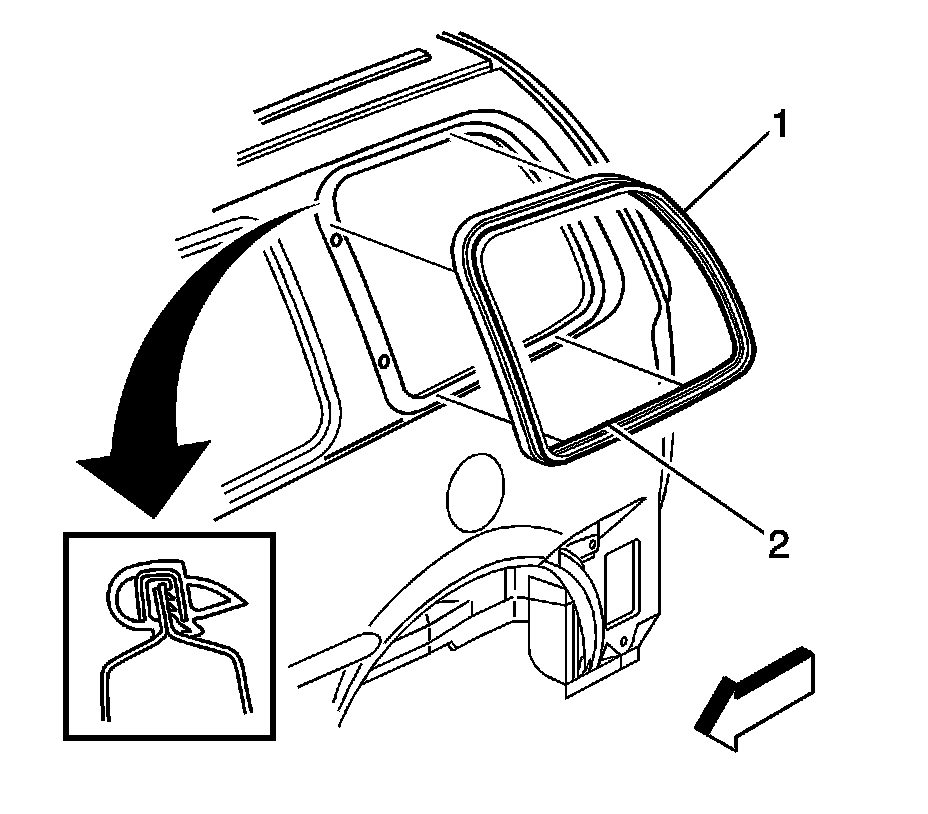 1. Remove the rear quarter window. Refer to Quarter Window Replacement (Without A20 Manual) (Quarter Window Replacement (Without A20 Manual))Quarter Window Replacement (With A20 Power) (Quarter Window Replacement (With A20 Power)).