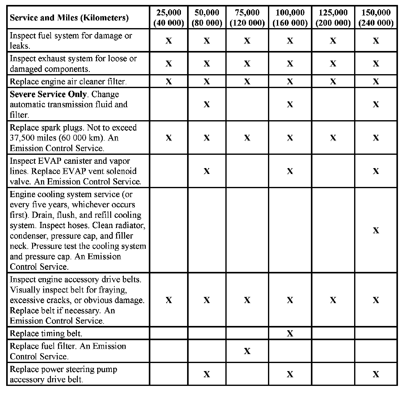 service (I or II) after the indicated miles (kilometers) shown for each item.