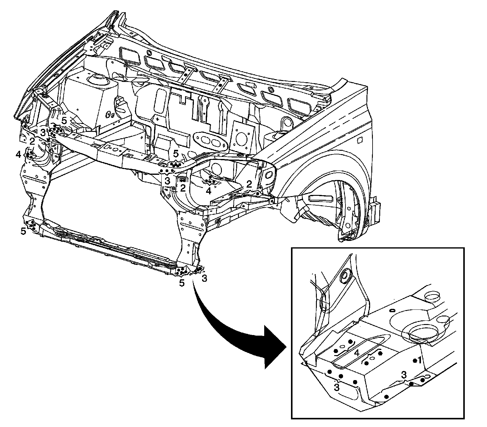 The front panel is joined to the front wheelhouse and front longitudinal. It forms the base for the headlamps and other parts and maintains the rigidity of the front section of the body. Pay particular attention to twists and parallelism and check mounting of related parts when welding.