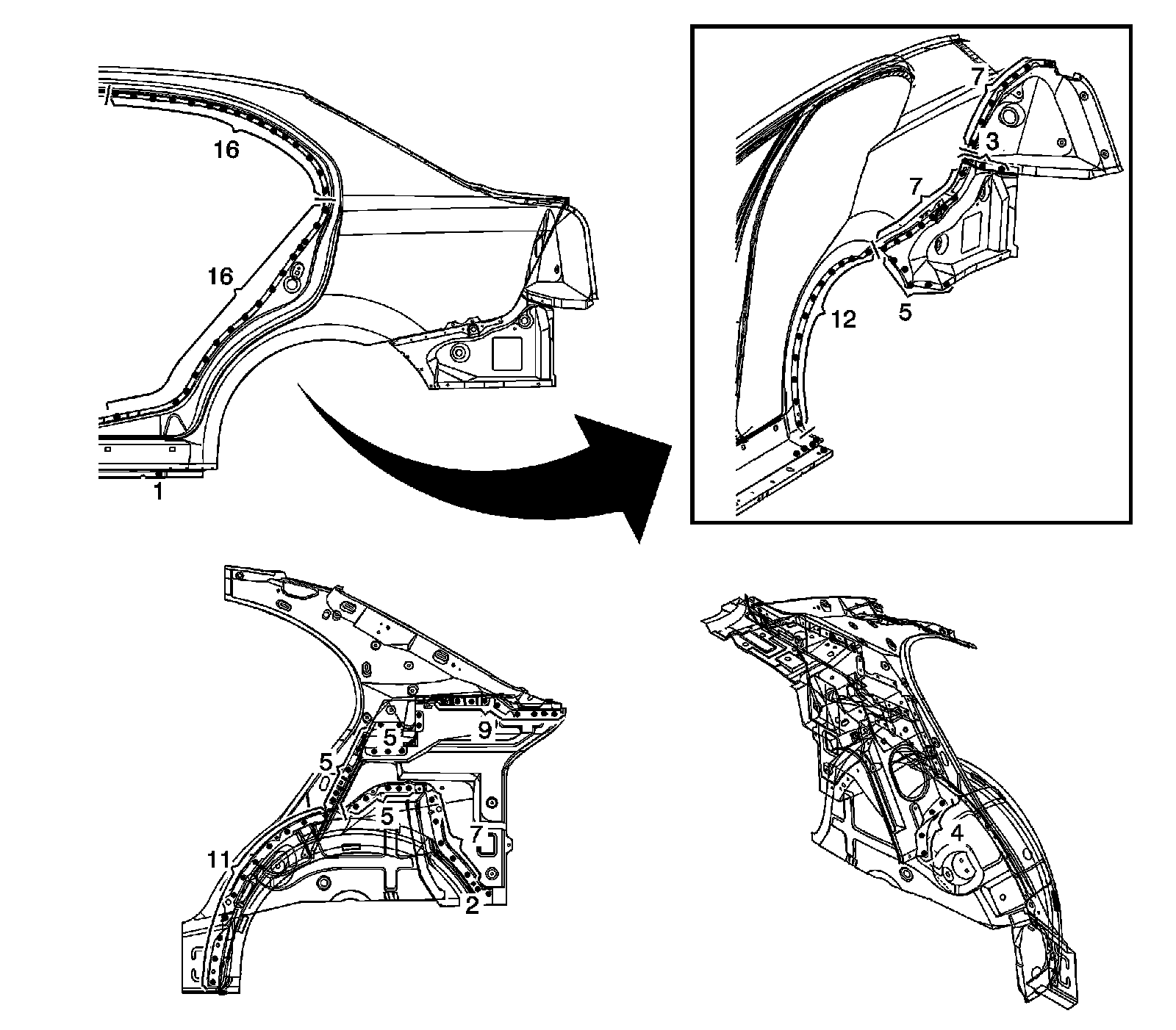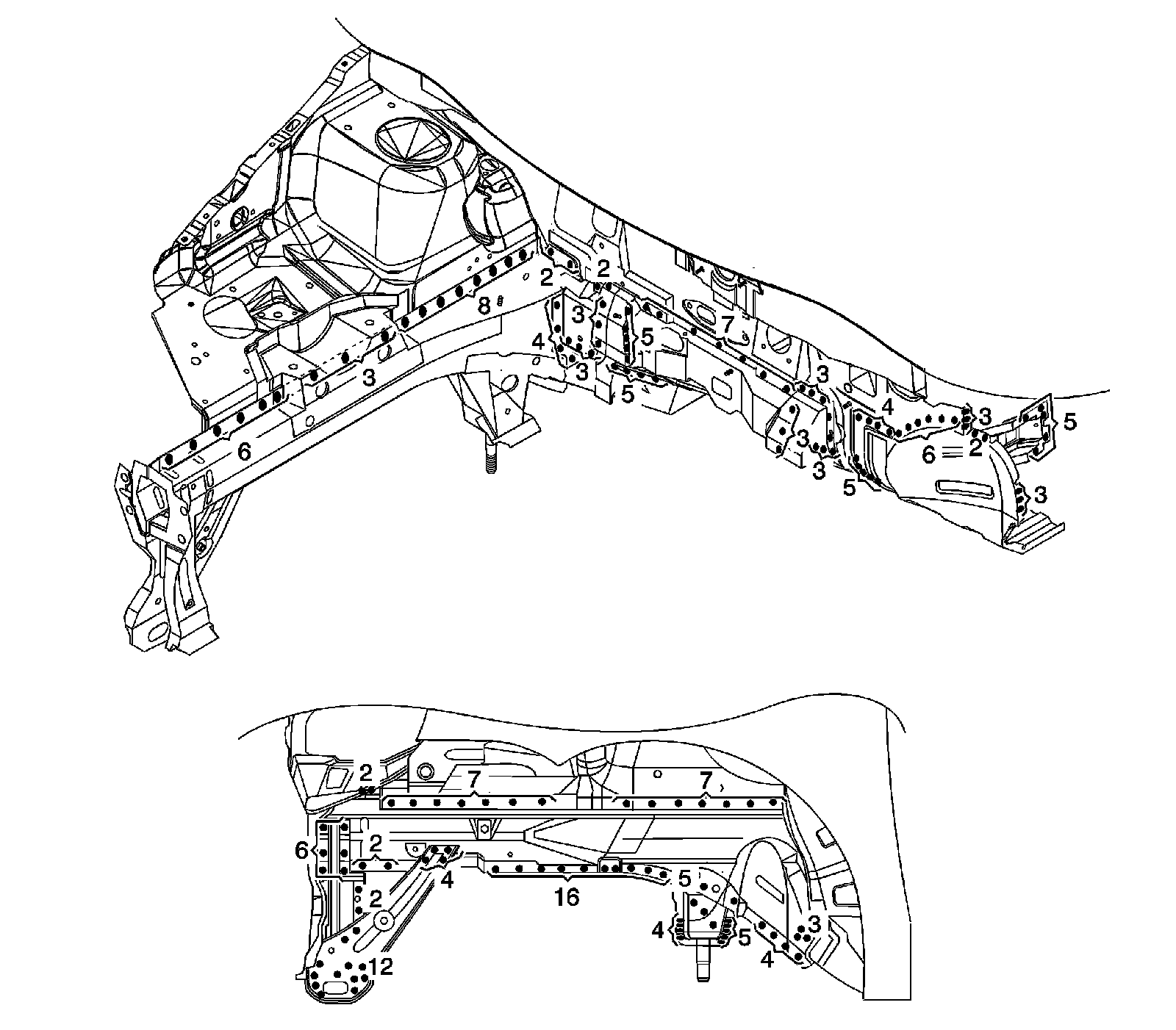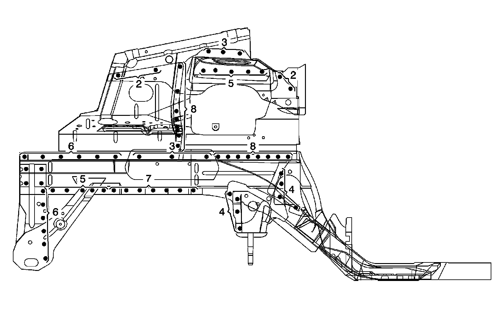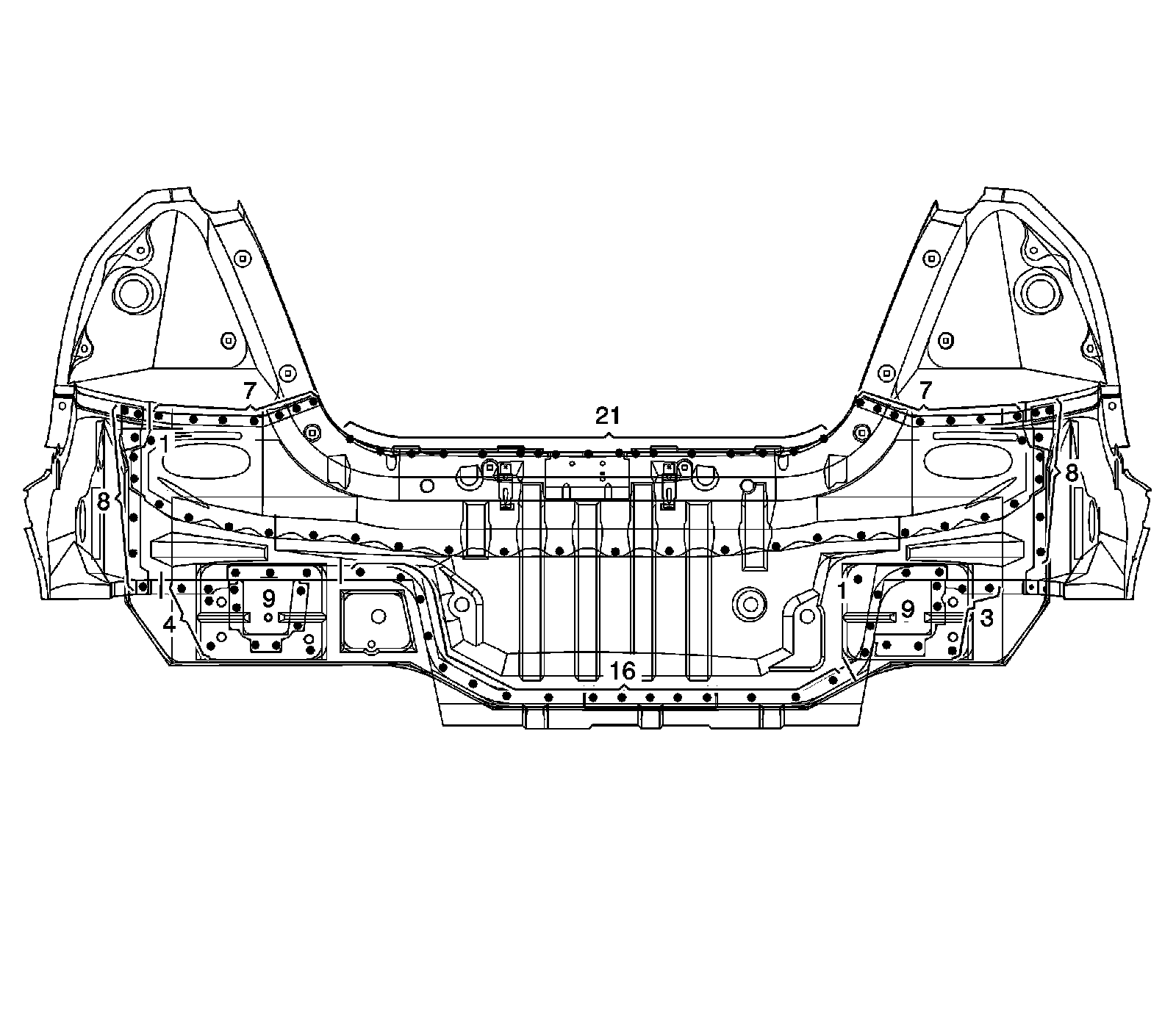 The rear floor panel is the base of the rear body and it is critical for the rigidity of the rear body. During replacement, refer to Dimensions - Body to determine the position to set the rear floor properly.