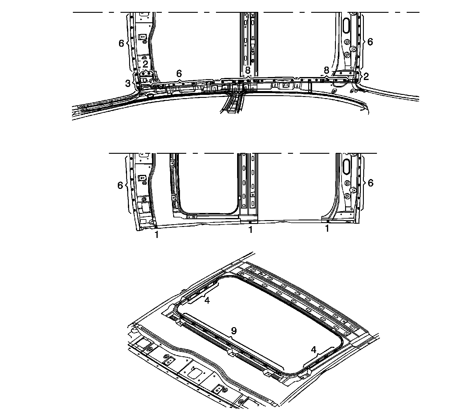 Deformation of the roof panel is highly noticeable in terms of the vehicle's outer appearance. Before replacing the roof, make sure that the body is horizontal. Before welding the roof panel, adjust the frame door opening flanges so that they contact the roof panel. Pay particular attention to twists and parallelism.