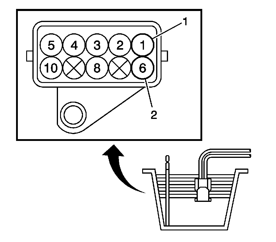 1. Measure the resistance of the transmission fluid temperature (TFT) sensor between terminals 1 and 6 (1, 2) of the TFT connector at 10°C (50°F) and 110°C (230°F).