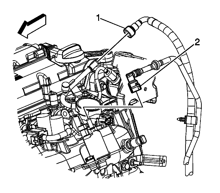 28. Disconnect the engine wiring harness electrical connector (2) from the knock sensor.