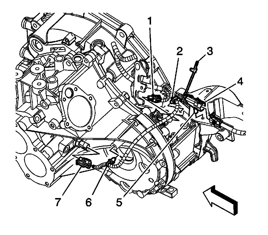 58. Disconnect the engine harness electrical connector (7) from the back up lamp switch.