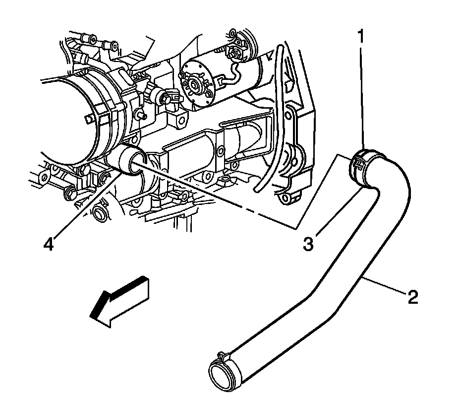 10. Position the J 38185 to the clamp (3) in order to remove the radiator inlet hose (2) from the water outlet housing (4).