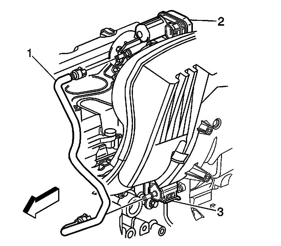 3. Disconnect the evaporative emission (EVAP) purge tube from the throttle body control module (2) and the EVAP canister purge solenoid valve (3). Refer to Plastic Collar Quick Connect Fitting Service (Plastic Collar Quick Connect Fitting Service).