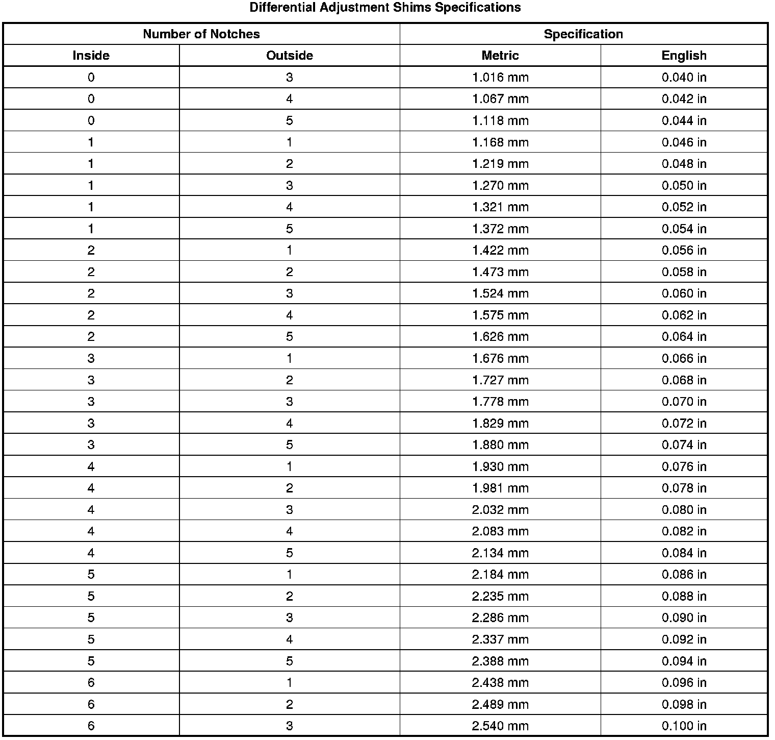 Differential Adjustment Shim Specifications