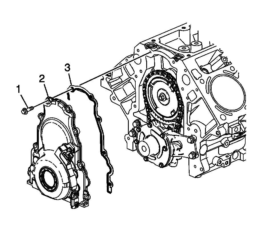 1. Install the front cover gasket (3), front cover (2), and bolts (1).