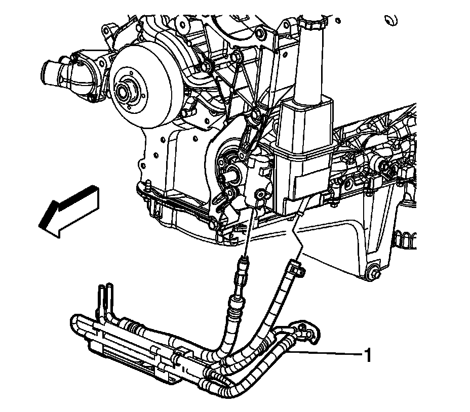 4. Disconnect the power steering gear inlet and outlet hose (1) from the power steering pump and power steering fluid reservoir assembly.