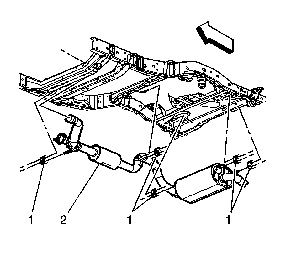 4. With the aid of an assistant, separate the muffler hangers from the insulators (1).