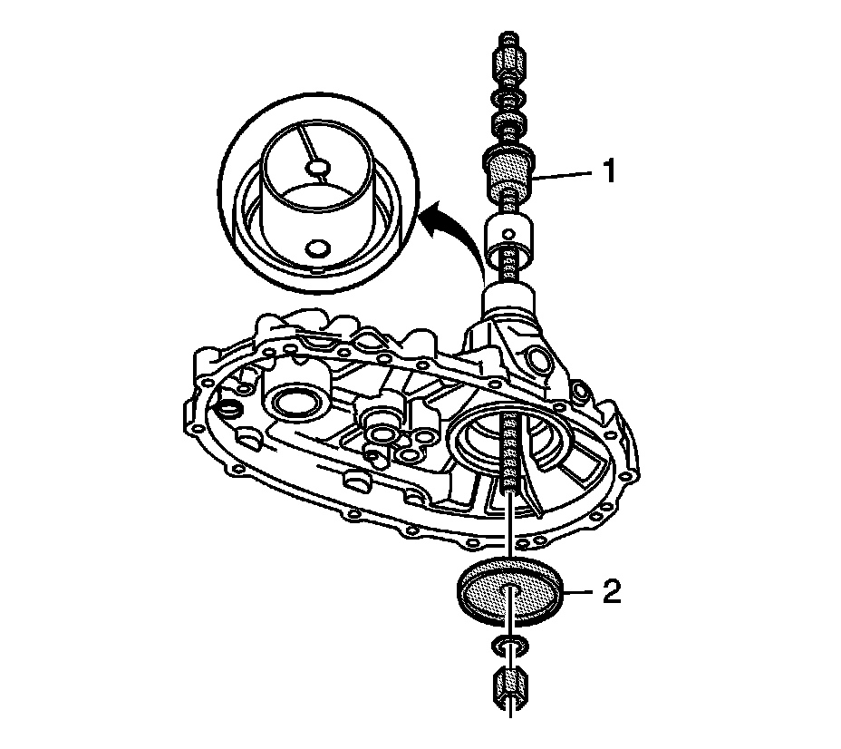 69. If removed, install the rear bushing in the rear case, using the J 45933-4 (1) and the J 45933-3 (2) of the J 45933 - assembly/disassembly kit.