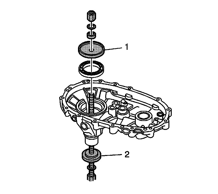 73. Install the rear output shaft bearing in the rear case half, using the J 45933-3 (1) and the J 45933-1 (2) of the J 45933 - assembly/disassembly kit.