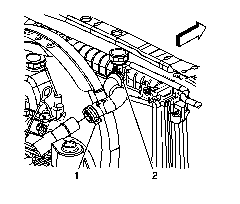 3. Using J 38185 reposition the radiator outlet hose clamp (2) from the radiator.
