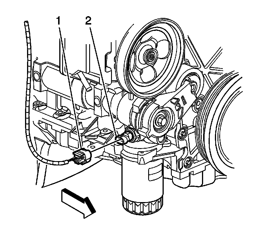2. Disconnect the engine wiring harness electrical connector (1) from the oil pressure switch (2).