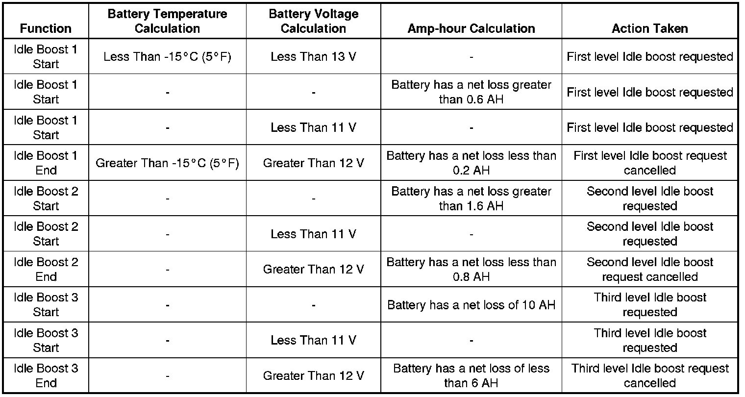 Idle boost is activated in incremental steps, idle boost 1 must be active before idle boost 2 can be active. The criteria used by the body control module (BCM) to regulate EPM are outlined below: