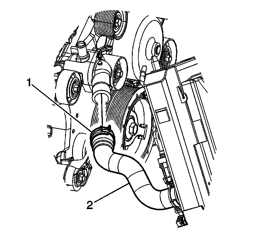 3. Disengage tension on the radiator outlet hose clamp (1) at the radiator using J 38185 - Hose Clamp Pliers
