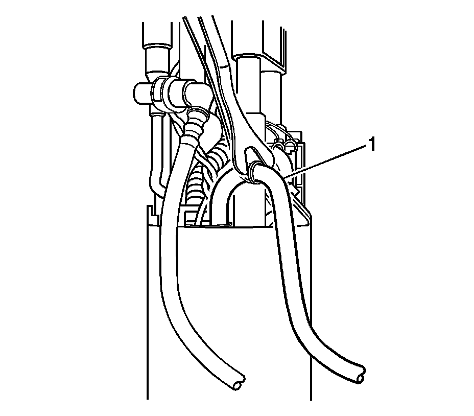6. With the aid of an assistant, use a Snap-on soft grip trim tool ASG187B or equivalent in order to insert the return line (1) into the module retainer cup.