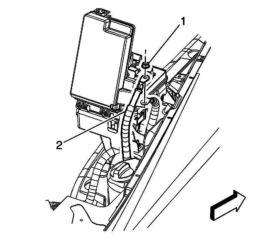 2. Remove the battery positive cable nut (1) and remove the battery positive/negative cable lead (2).