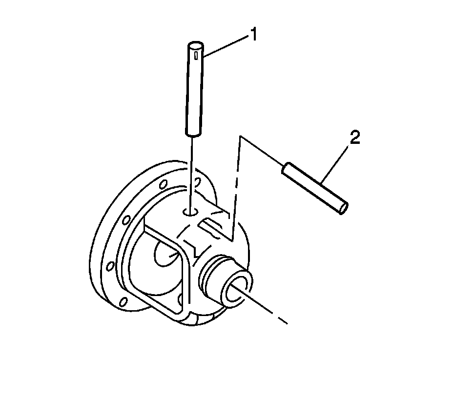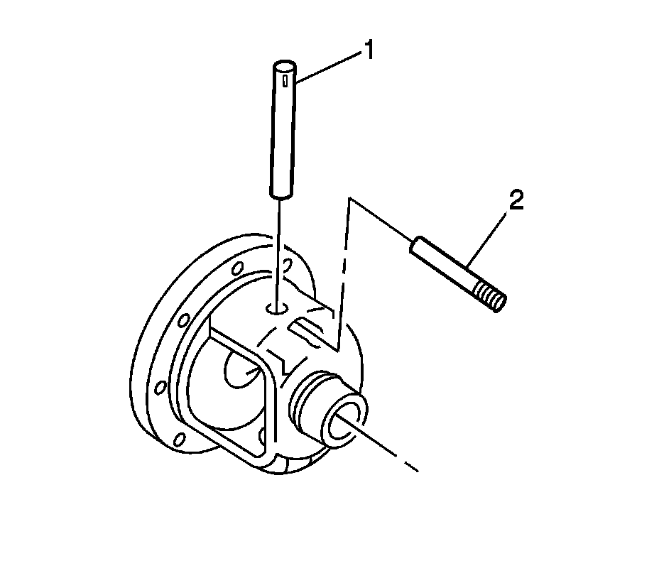 5. For the 10.5 and the 10.75 in axle, use a hammer and the appropriate size drift pin, remove the differential pinion gear shaft pin (2) and the differential pinion gear shaft (1).