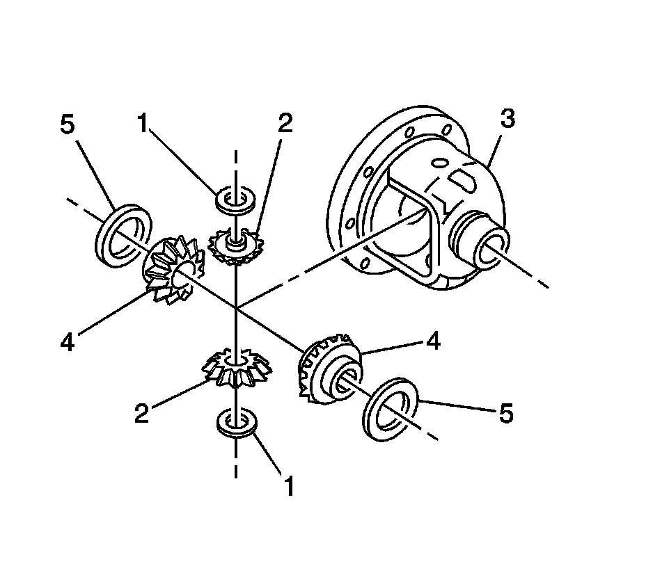 7. Remove the differential side gears (5) and thrust washers (4) from the differential case (3).