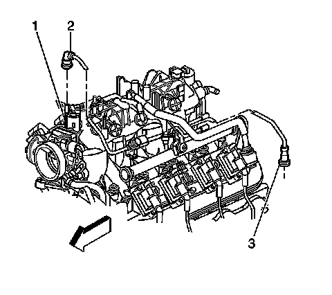 5. Install the EVAP purge solenoid (3), isolator (1), and bolt (2) to the intake manifold. Tighten the EVAP purge solenoid bolt to 10 Nm (89 lb in).