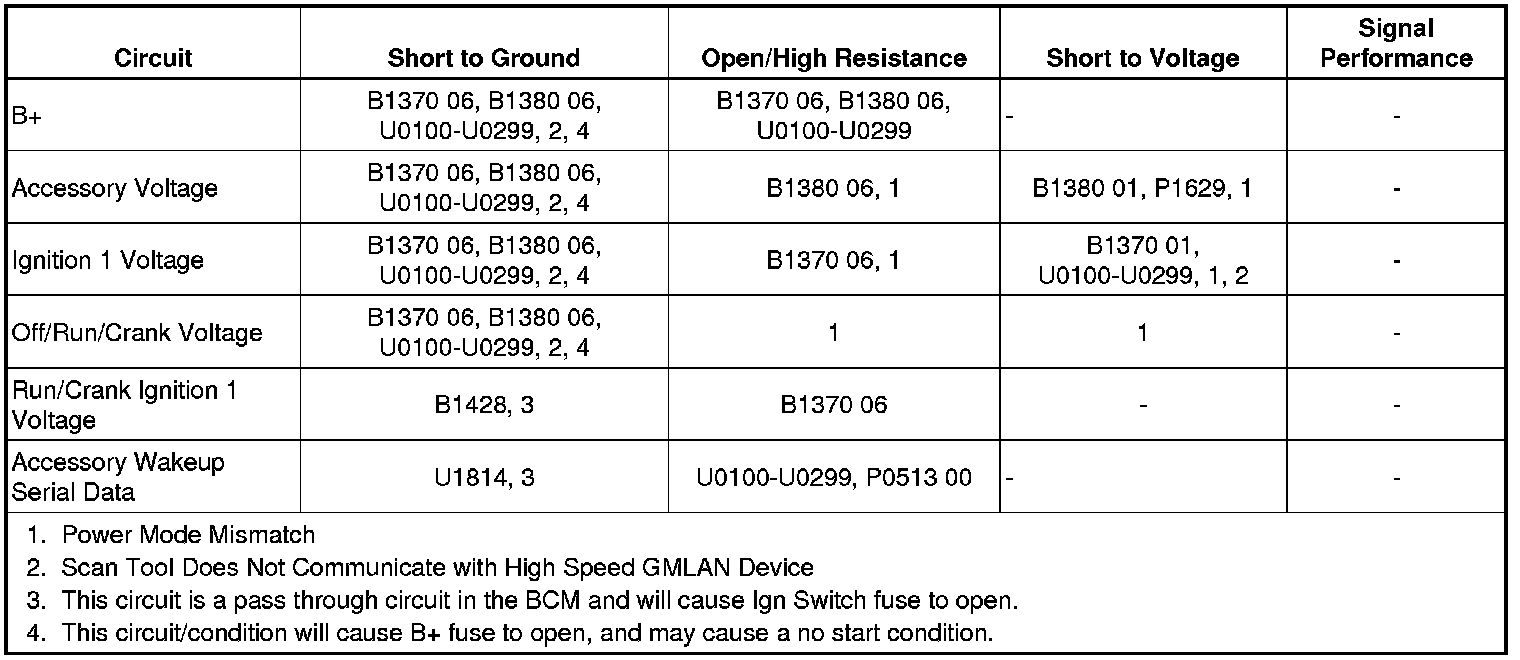 BCM senses an open or short to voltage on the off/run/crank voltage circuit when both ignition accessory/run and ignition run/crank parameters are active.